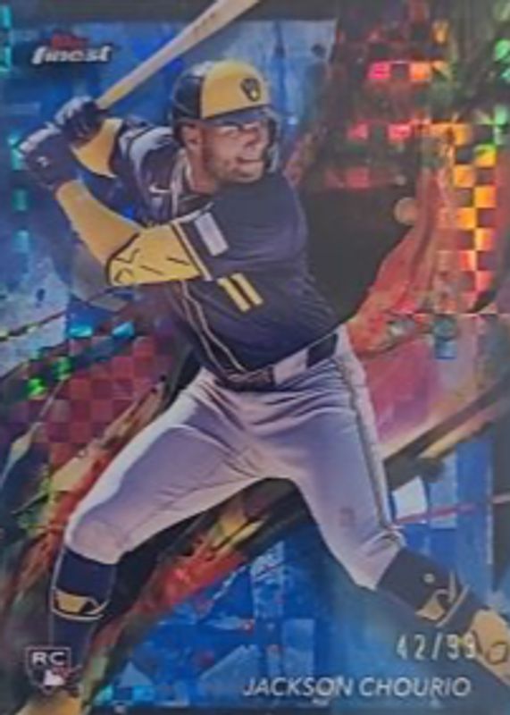 The Jackson Chourio 2024 Topps Finest #11 Common - Blue Checkerboard Refractor /99 Rookie card in Raw condition has not changed in price in the last 30 days and was last sold for $11.95 .