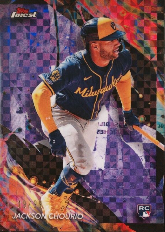 The Jackson Chourio 2024 Topps Finest #159 Uncommon - Purple Checkerboard Refractor /99 Rookie card in Raw condition has not changed in price in the last 30 days and was last sold for $5.50 .