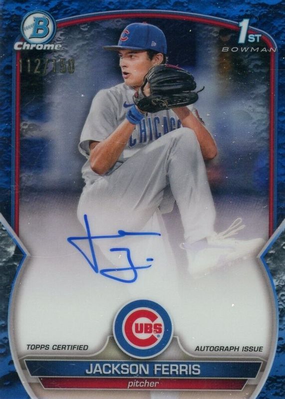 The Jackson Ferris 2023 Bowman #CPA-JF Chrome Prospect Auto - Blue Lunar Crater Refractor /150 (1st) card in Raw condition has not changed in price in the last 30 days and was last sold for $43.89 .
