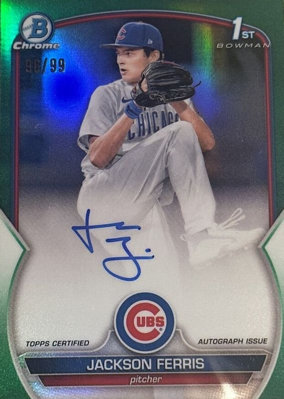 The Jackson Ferris 2023 Bowman #CPA-JF Chrome Prospect Auto - Green Refractor /99 (1st) card in Raw condition has not changed in price in the last 30 days and was last sold for $61.00 .