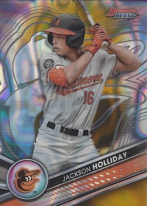 This card is 1 of 21 Jackson Holliday's card variations in the 2022 Bowman's Best set being tracked by Sports Card Investor, including Top Prospects, Top Prospects - Atomic Refractor, Top Prospects - Refractor, Top Prospects - Mini-Diamond Refractor /299, and Top Prospects - Purple Refractor /250.