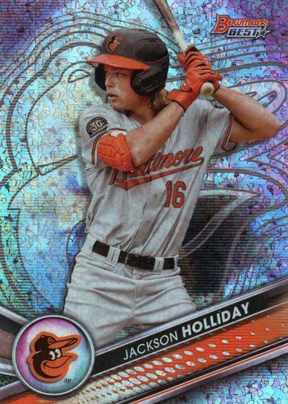 The Jackson Holliday 2022 Bowman's Best #TP-2 Top Prospects - Mini-Diamond Refractor /299 card in Raw condition has not changed in price in the last 30 days and was last sold for $12.99 .