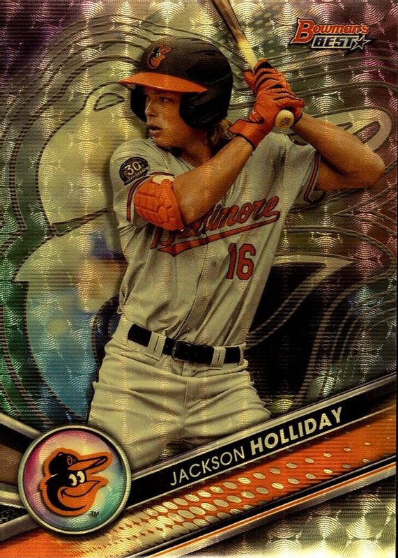 This card is 1 of 21 Jackson Holliday's card variations in the 2022 Bowman's Best set being tracked by Sports Card Investor, including Top Prospects, Top Prospects - Atomic Refractor, Top Prospects - Refractor, Top Prospects - Mini-Diamond Refractor /299, and Top Prospects - Purple Refractor /250.