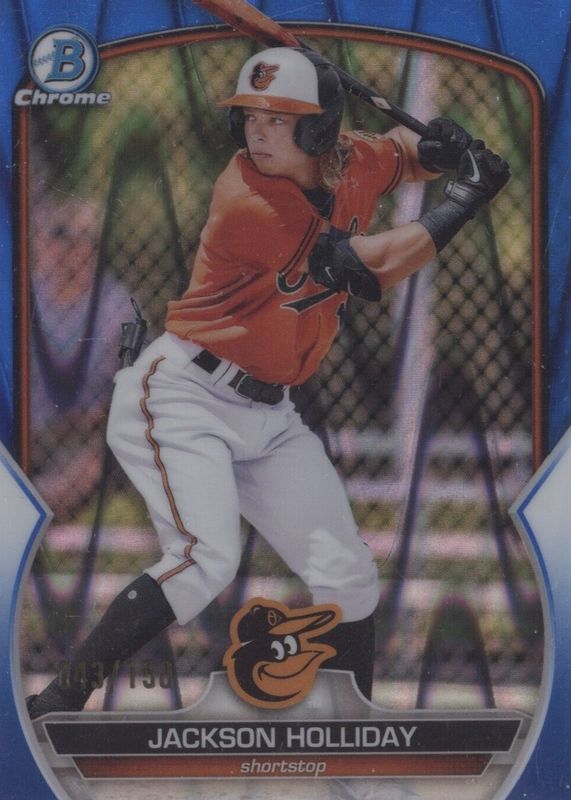 The Jackson Holliday 2023 Bowman #BCP-20 Chrome Prospects - Blue RayWave Refractor /150 card in Raw condition has not changed in price in the last 30 days and was last sold for $24.00 .