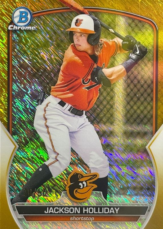 The Jackson Holliday 2023 Bowman #BCP-20 Chrome Prospects - Gold Shimmer Refractor /50 card in Raw condition has not changed in price in the last 30 days and was last sold for $40.00 .