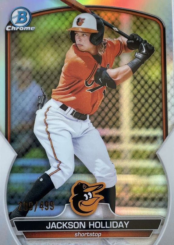 The Jackson Holliday 2023 Bowman #BCP-20 Chrome Prospects - Refractor /499 card in Raw condition has moved down -$12.01 (-70.6%) in the last 30 days and was last sold for $4.99 .