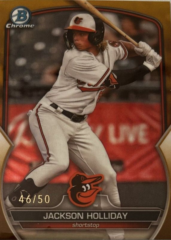 The Jackson Holliday 2023 Bowman Draft #BDC-118 Chrome - Gold Refractor /50 card in Raw condition has not changed in price in the last 30 days and was last sold for $61.00 .