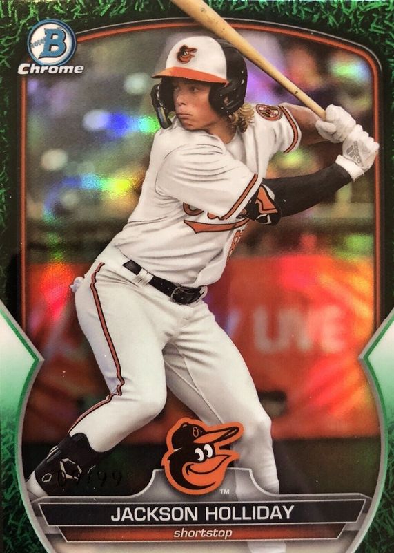 The Jackson Holliday 2023 Bowman Draft #BDC-118 Chrome - Green Grass Refractor /99 card in Raw condition has not changed in price in the last 30 days and was last sold for $7.99 .