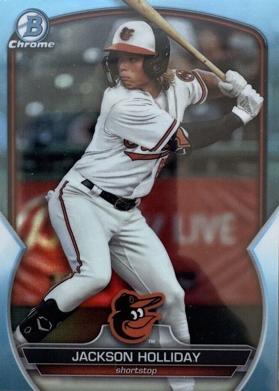 The Jackson Holliday 2023 Bowman Draft #BDC-118 Chrome - Sky Blue Refractor card in Raw condition has moved up $8.87 (+391%) in the last 30 days and was last sold for $11.14 .