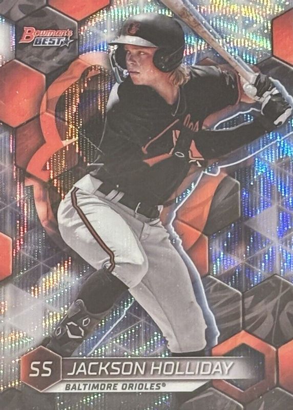 The Jackson Holliday 2023 Bowman's Best #TP-12 Top Prospects - Wave Refractor card in Raw condition has not changed in price in the last 30 days and was last sold for $2.45 .