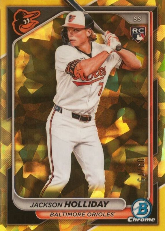 The Jackson Holliday 2024 Bowman Chrome Sapphire Edition Yellow /75 Rookie card in Raw condition has not changed in price in the last 30 days and was last sold for $26.77 .