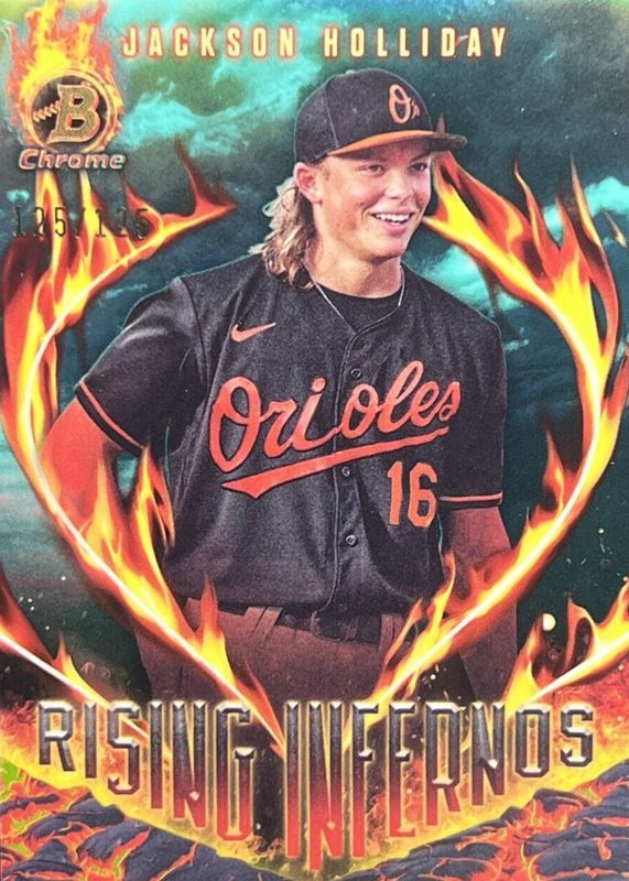 The Jackson Holliday 2024 Bowman #RI-9 Rising Infernos - Aqua Refractor /125 Rookie card in Raw condition has not changed in price in the last 30 days and was last sold for $15.00 .