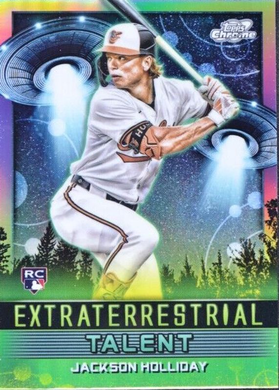 The Jackson Holliday 2024 Topps Chrome Cosmic #ET-8 Extraterrestrial Talent Rookie card in Raw condition has moved up $1.01 (+14.4%) in the last 30 days and was last sold for $8.00 .