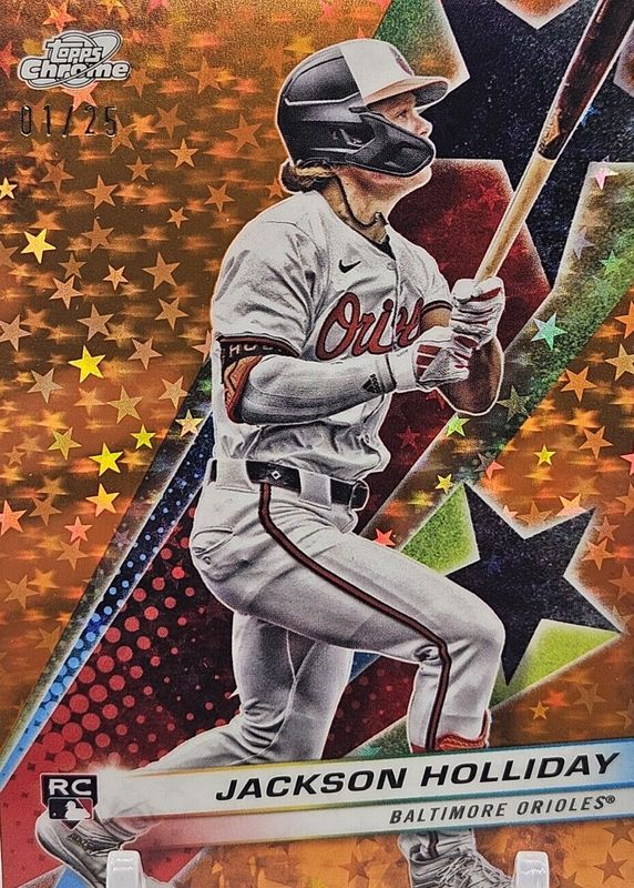 The Jackson Holliday 2024 Topps Chrome Cosmic #SF-86 Starfractor - Orange Galactic Refractor /25 Rookie card in Raw condition has not changed in price in the last 30 days and was last sold for $104.00 .