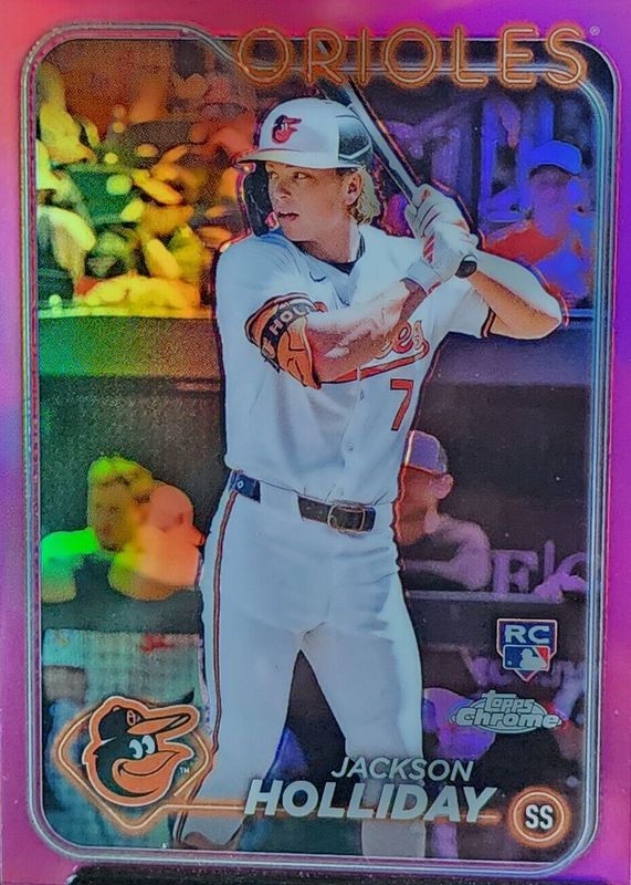 The Jackson Holliday 2024 Topps Chrome #88 Pink Refractor Rookie card in Raw condition has moved up $4.01 (+405%) in the last 30 days and was last sold for $5.00 .