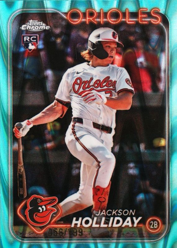 The Jackson Holliday 2024 Topps Chrome Update #USC200 Aqua RayWave Refractor /199 Rookie card in Raw condition has not changed in price in the last 30 days and was last sold for $25.00 .