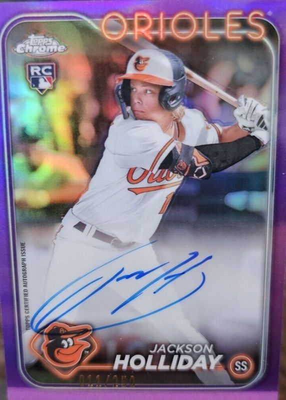 The Jackson Holliday 2024 Topps Chrome Update #AC-JH Autographs - Purple Refractor /250 Rookie card in Raw condition has not changed in price in the last 30 days and was last sold for $295.00 .
