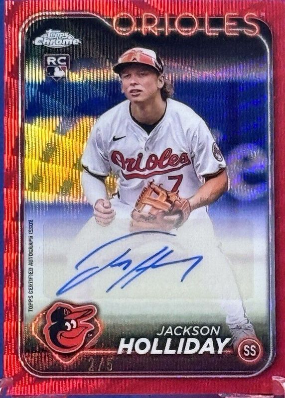 The Jackson Holliday 2024 Topps Chrome Update #AC-JH Autographs - Red Refractor /5 Rookie card in Raw condition has not changed in price in the last 30 days and was last sold for $1,711.00 .