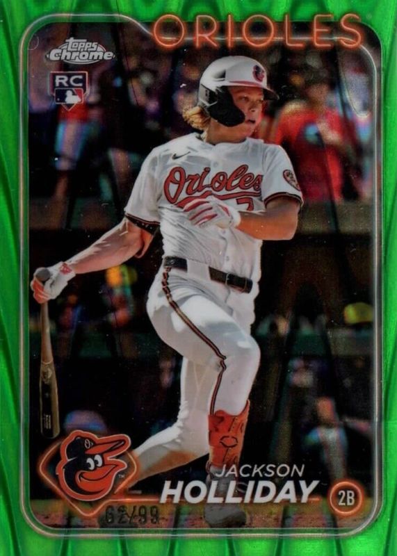 The Jackson Holliday 2024 Topps Chrome Update #USC200 Green RayWave Refractor /99 Rookie card in Raw condition has not changed in price in the last 30 days and was last sold for $40.00 .