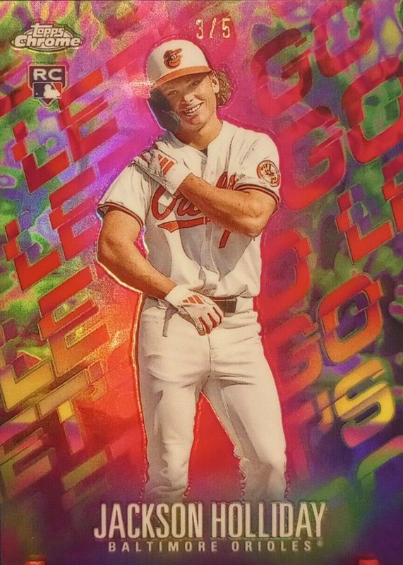 The Jackson Holliday 2024 Topps Chrome Update #LGC-50 Let's Go - Red Refractor /5 Rookie card in Raw condition has not changed in price in the last 30 days and was last sold for $501.00 .
