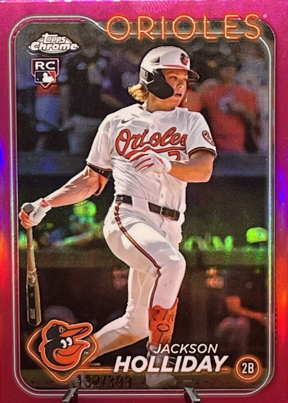 The Jackson Holliday 2024 Topps Chrome Update #USC200 Magenta Refractor /399 Rookie card in Raw condition has moved down -$2.50 (-20.0%) in the last 30 days and was last sold for $10.00 .