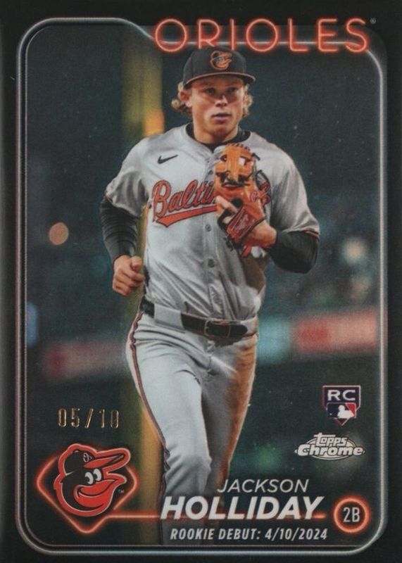 The Jackson Holliday 2024 Topps Chrome Update #USC89 Rookie Debut - Black Refractor /10 card in Raw condition has not changed in price in the last 30 days and was last sold for $500.00 .
