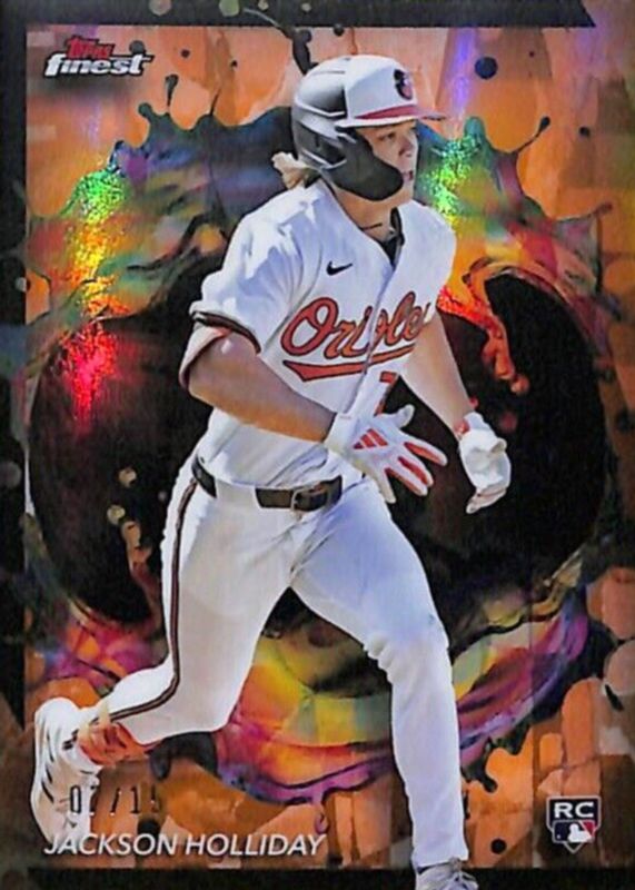 The Jackson Holliday 2024 Topps Finest #240 Rare - Orange Refractor /15 Rookie card in Raw condition has not changed in price in the last 30 days and was last sold for $366.00 .