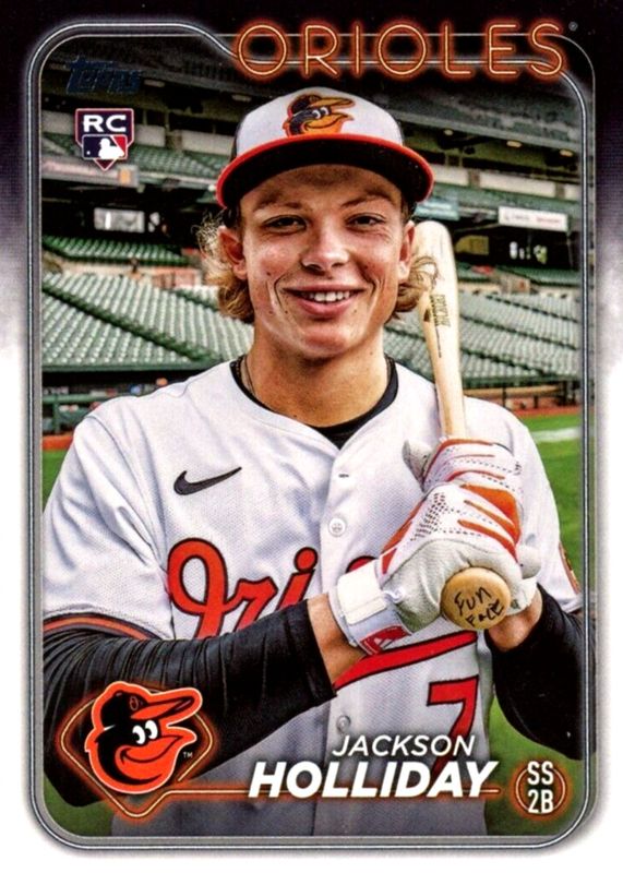 The Jackson Holliday 2024 Topps #697 Fun Face Variation Rookie card in Raw condition has moved down -$50.00 (-16.7%) in the last 30 days and was last sold for $250.00 .