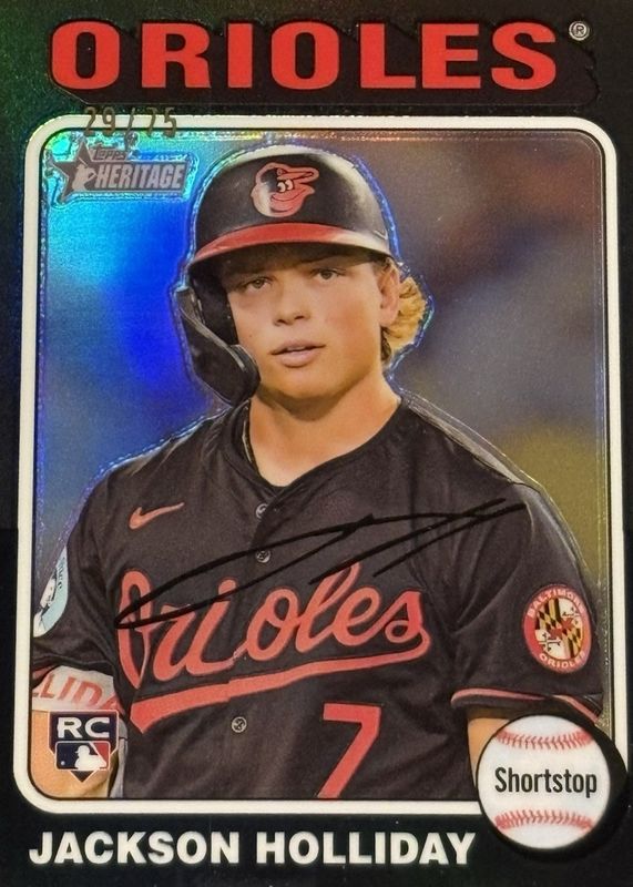 The Jackson Holliday 2024 Topps Heritage High Number #692 Chrome - Black Border /75 Rookie card in Raw condition has not changed in price in the last 30 days and was last sold for $131.28 .