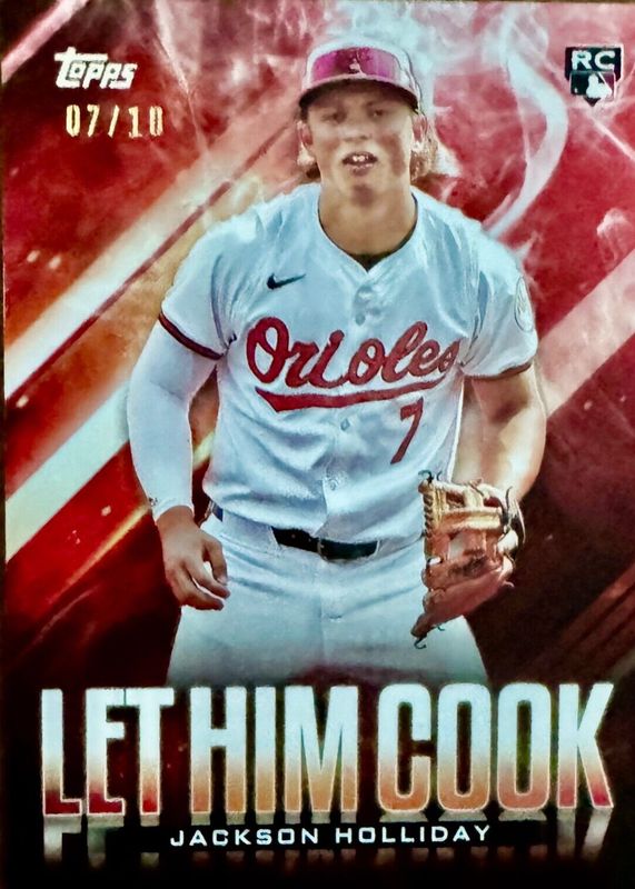The Jackson Holliday 2024 Topps Update #LHC-25 Let Him Cook - Red /25 Rookie card in Raw condition has not changed in price in the last 30 days and was last sold for $39.99 .