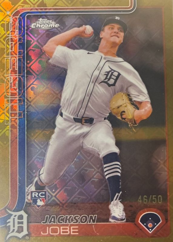 The Jackson Jobe 2025 Topps Chrome Logofractor Edition #249 Gold Refractor /50 Rookie card in Raw condition has not changed in price in the last 30 days and was last sold for $40.00 .