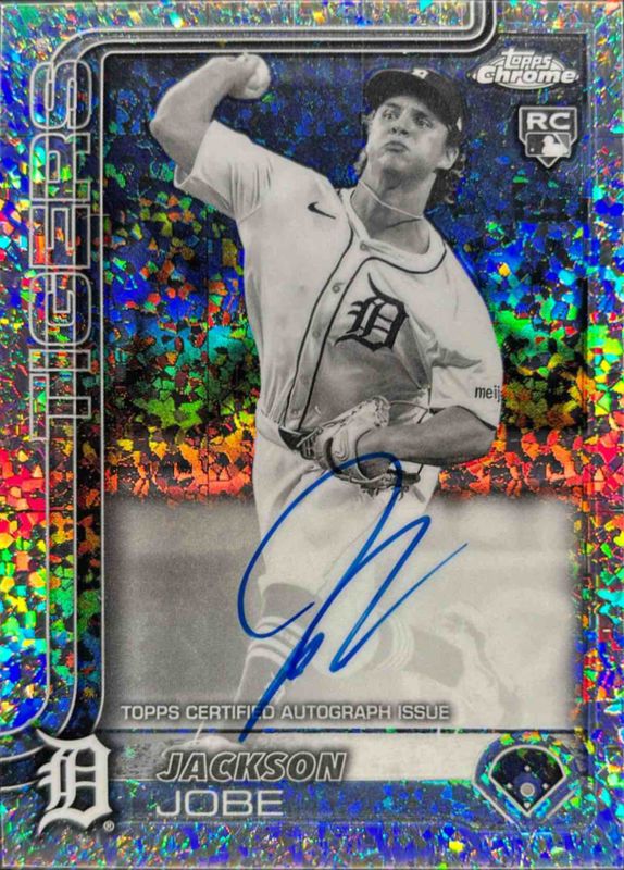 The Jackson Jobe 2025 Topps Chrome #RA-JJO Rookie Autographs - B&W Mini-Diamond Refractor card is 1 of 117 Jackson Jobe's card variations in the 2025 Topps Chrome set being tracked by Sports Card Investor, including Base, Geometric Refractor, Image Variation, Lightboard Logo Variation, and Negative Refractor.