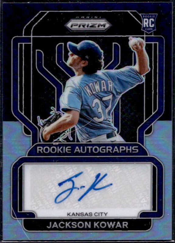 The Jackson Kowar 2022 Prizm #RA-JK Rookie Autographs - Navy Blue Carolina Blue /25 card is 1 of 64 Jackson Kowar's card variations in the 2022 Prizm set being tracked by Sports Card Investor, including Base, Blue, Blue Velocity, Carolina Blue, and Cosmic Haze.