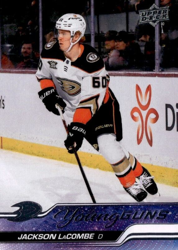 This card is 1 of 9 Jackson LaCombe's card variations in the 2023 Upper Deck set being tracked by Sports Card Investor, including Young Guns - Clear Cut, Young Guns - Jumbo, Young Guns - Outburst Silver, Young Guns - Deluxe /250, and Young Guns - UD Exclusives /100.