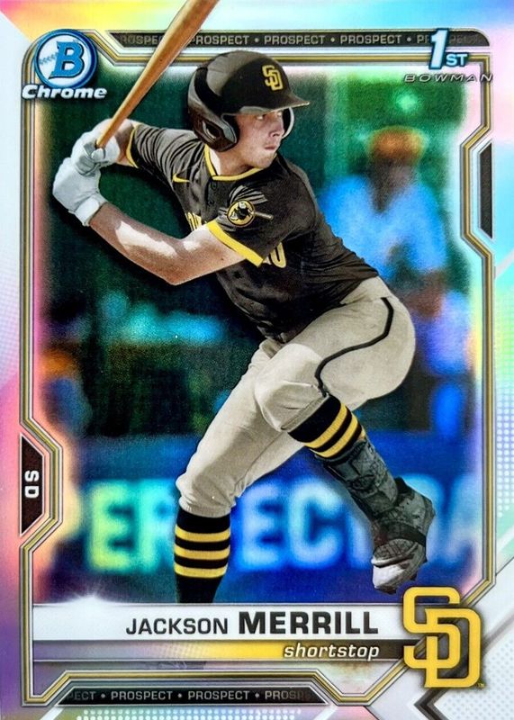 The Jackson Merrill 2021 Bowman Draft #BDC-119 Chrome - Refractor (1st) card in Raw condition has moved up $2.95 (+36.6%) in the last 30 days and was last sold for $11.00 .