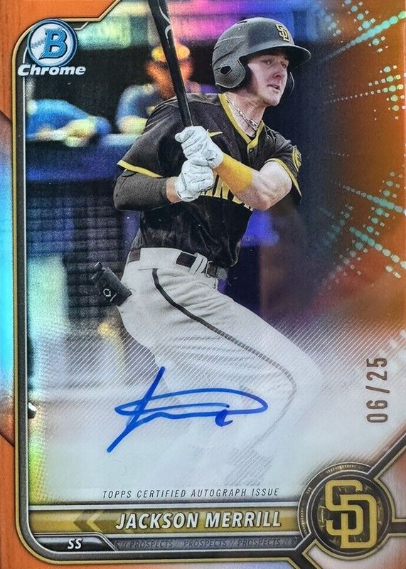 Auctions Ending Soon for Jackson Merrill 2022 Bowman Chrome #CPA-JME Prospect Auto - Orange Refractor /25 RAW