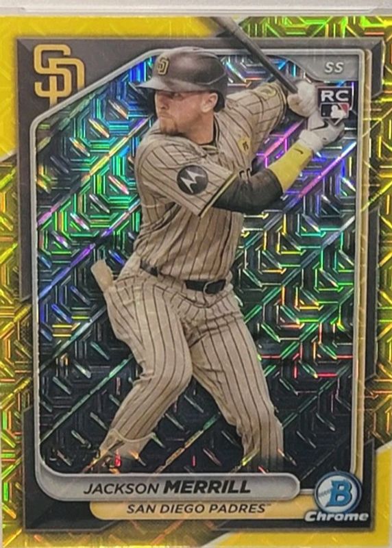 Jackson Merrill 2024 Bowman Chrome Mega Box #27 Yellow Mojo Refractor /75 Rookie RAW Price Guide