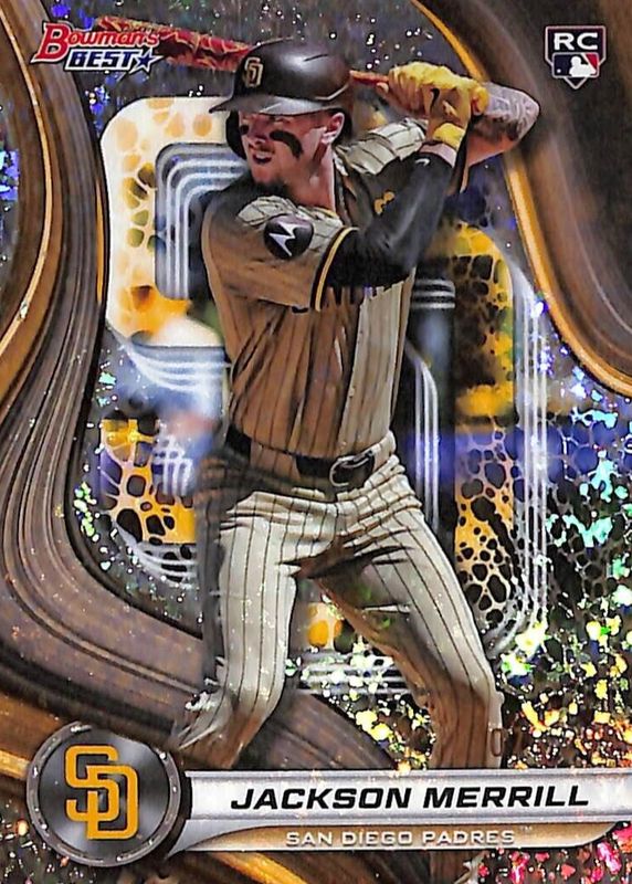 The Jackson Merrill 2024 Bowman's Best #56 Mini-Diamond Refractor /299 Rookie card in Raw condition has moved up $7.50 (+100%) in the last 30 days and was last sold for $15.00 .