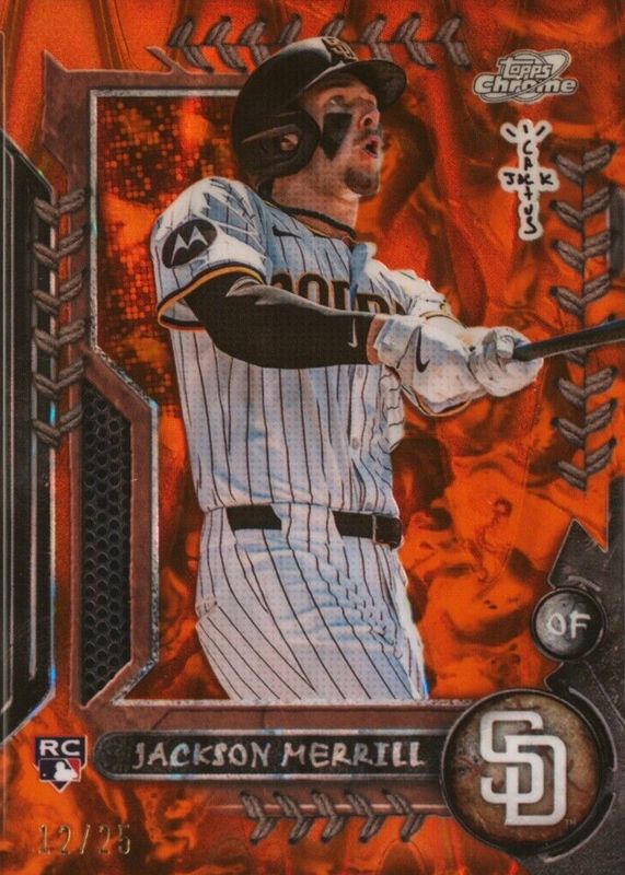 The Jackson Merrill 2024 Topps Chrome Cosmic x Cactus Jack #19 Orange Refractor /25 Rookie card in Raw condition has not changed in price in the last 30 days and was last sold for $635.00 .