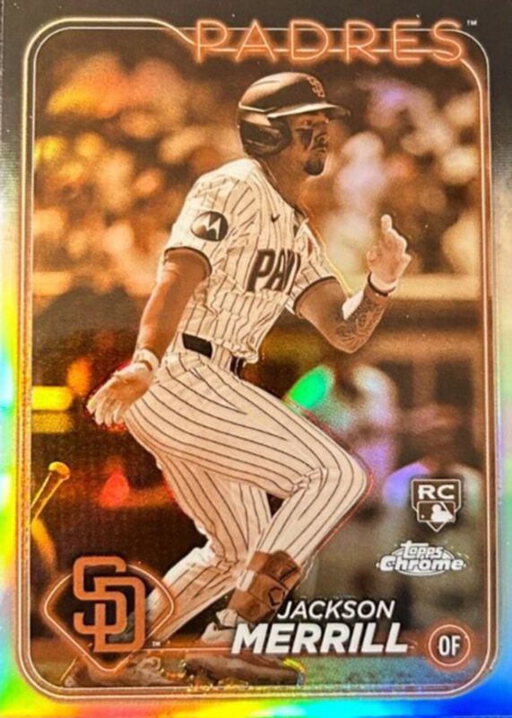 The Jackson Merrill 2024 Topps Chrome #207 Sepia Refractor Rookie card in Raw condition has moved up $1.50 (+75.4%) in the last 30 days and was last sold for $3.49 .