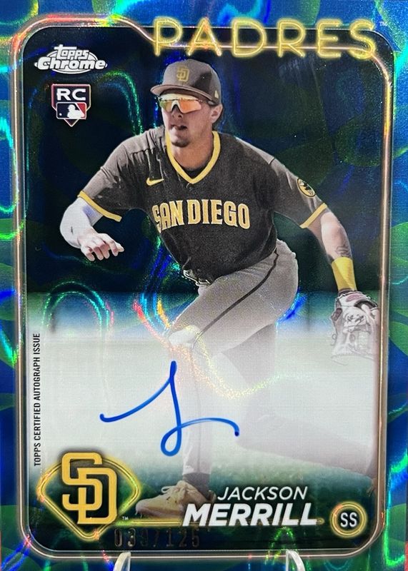 The Jackson Merrill 2024 Topps Chrome Update #RA-JME Autographs - Blue & Green Lava Lamp Refractor /125 Rookie card in Raw condition has not changed in price in the last 30 days and was last sold for $149.99 .