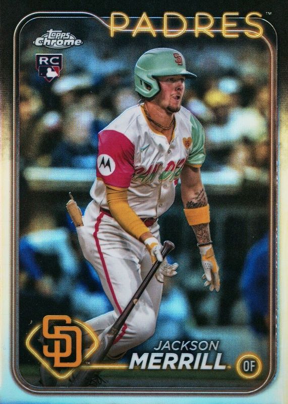 The Jackson Merrill 2024 Topps Chrome Update #USC153 Refractor Rookie card in Raw condition has moved down -$1.86 (-41.2%) in the last 30 days and was last sold for $2.65 .