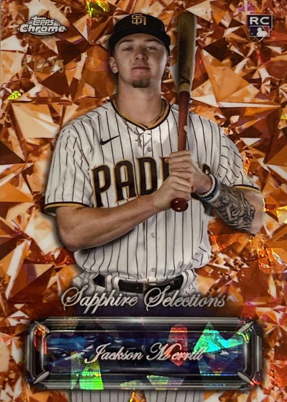 The Jackson Merrill 2024 Topps Chrome Update Sapphire Edition #SS-22 Sapphire Selections - Orange /25 Rookie card in Raw condition has not changed in price in the last 30 days and was last sold for $133.50 .