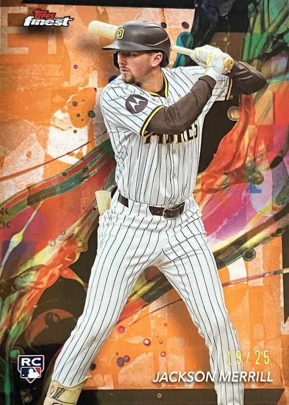 The Jackson Merrill 2024 Topps Finest #96 Common - Orange Refractor /25 Rookie card in Raw condition has not changed in price in the last 30 days and was last sold for $91.52 .