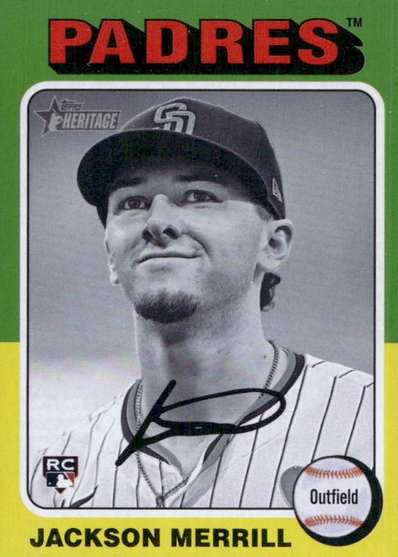 The Jackson Merrill 2024 Topps Heritage High Number #689 Black & White Image Variation Rookie card in Raw condition has not changed in price in the last 30 days and was last sold for $34.00 .