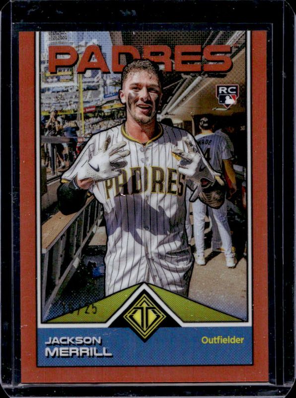 The Jackson Merrill 2024 Topps Transcendent #33 Image Variations - Orange Refractor /25 Rookie card is 1 of 35 Jackson Merrill's card variations in the 2024 Topps Transcendent set being tracked by Sports Card Investor, including Base, Orange Refractor /25, Black Refractor /10, Red Refractor /5, and Superfractors /1.