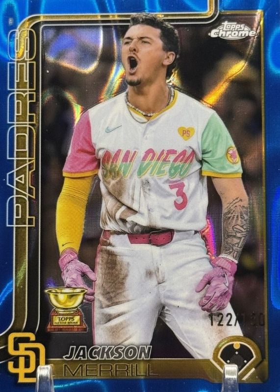 The Jackson Merrill 2025 Topps Chrome #61 Blue Lava Refractor /150 card in Raw condition has not changed in price in the last 30 days and was last sold for $0.99 .