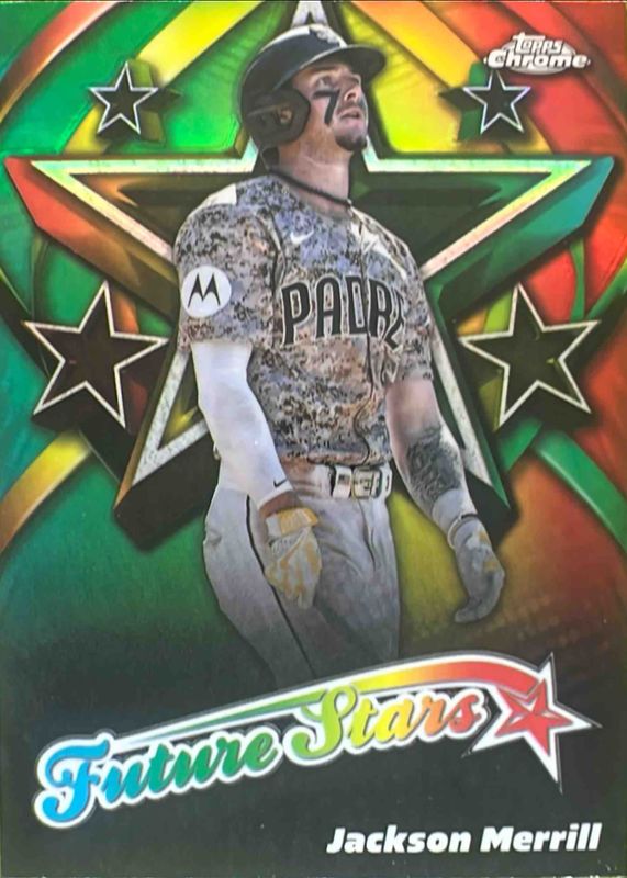 The Jackson Merrill 2025 Topps Chrome #FS-3 Future Stars card is 1 of 108 Jackson Merrill's card variations in the 2025 Topps Chrome set being tracked by Sports Card Investor, including Base, Geometric Refractor, Image Variation, Lightboard Logo Variation, and Negative Refractor.