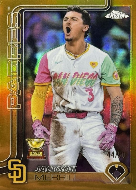 The Jackson Merrill 2025 Topps Chrome #61 Gold Refractor /50 card in Raw condition has not changed in price in the last 30 days and was last sold for $31.50 .
