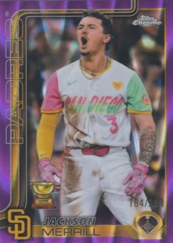 The Jackson Merrill 2025 Topps Chrome #61 Purple Refractor /250 card in Raw condition has moved up $0.26 (+26.3%) in the last 30 days and was last sold for $1.25 .
